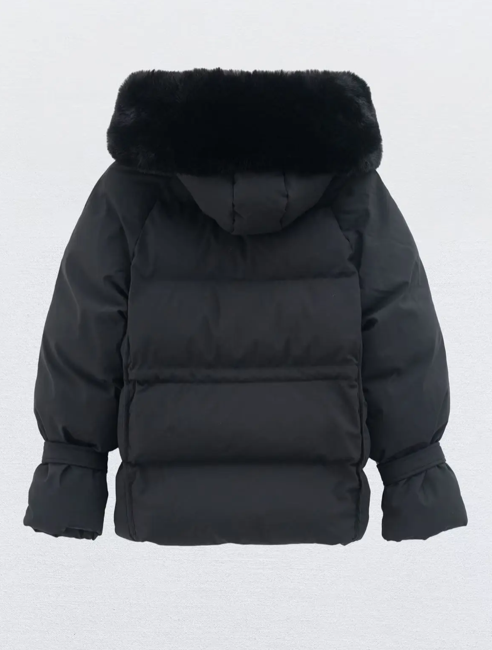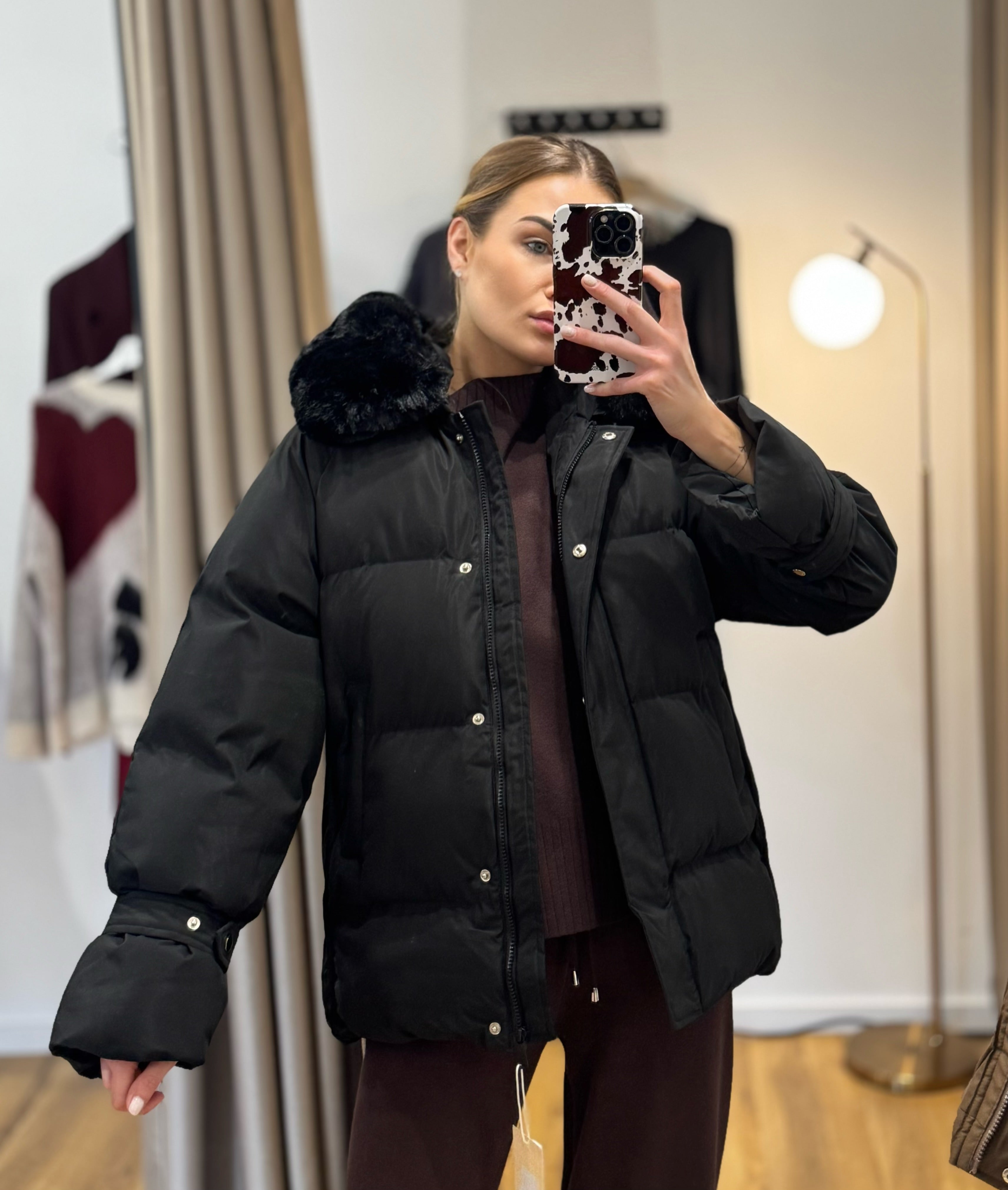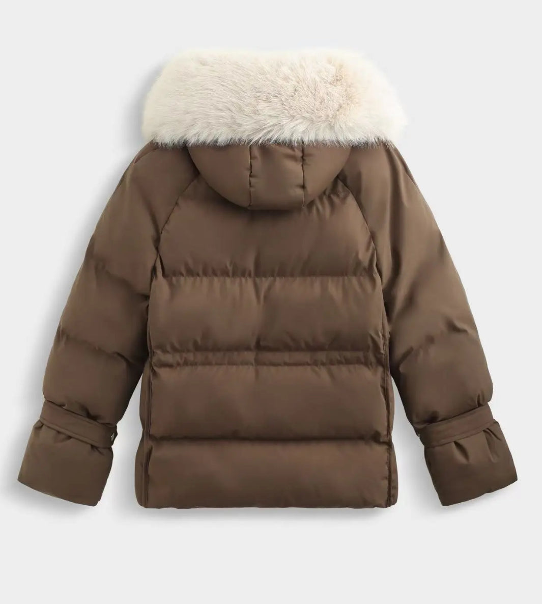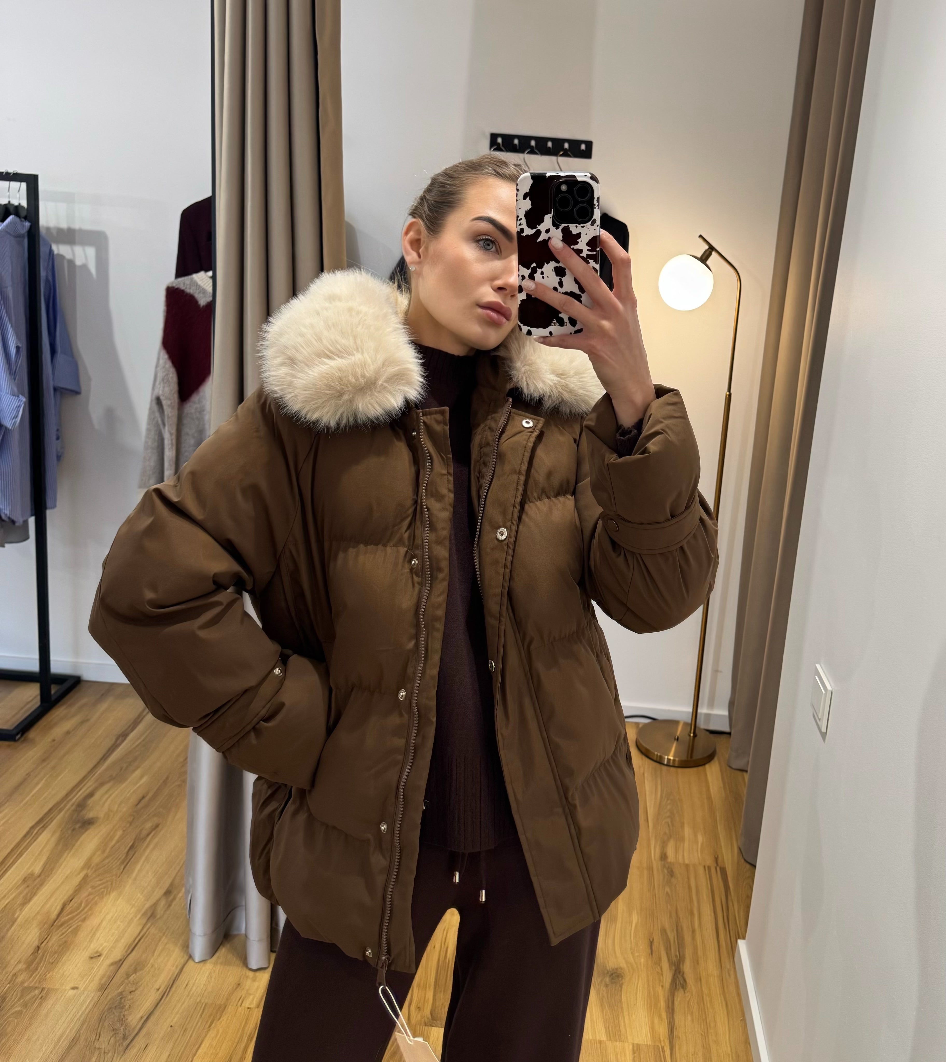 Dygsniuota pūkinė striukė eko pukų. Nusegamas gobtuvas su dirbtinio kailio apdaila. Ilgos rankovės su reguliuojamomis juostelėmis ir spaudėmis rankogaliuose. Priekyje – dvi įleistinės kišenės. Paslėptas užtrauktukas po atvartu su spaudėmis.