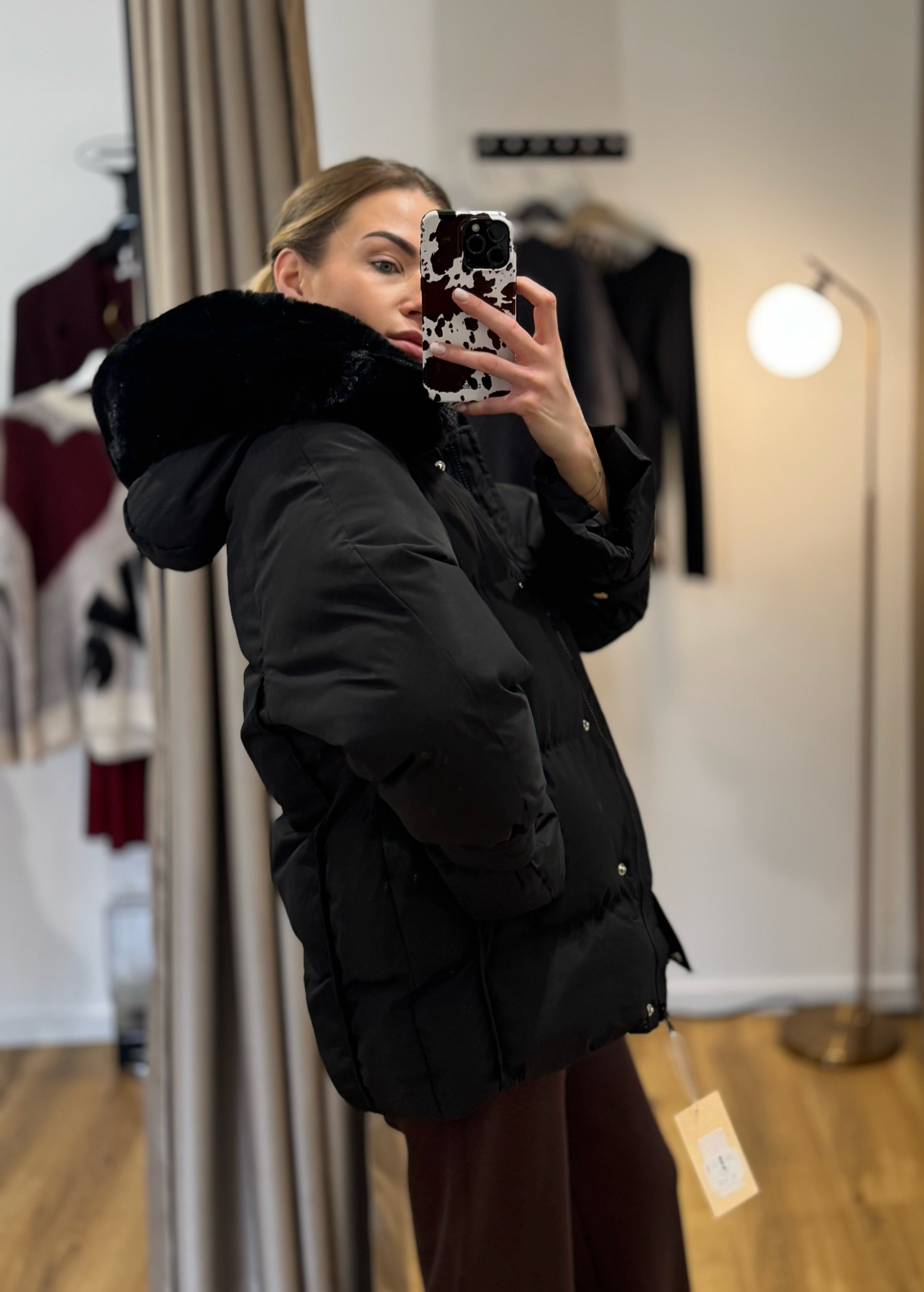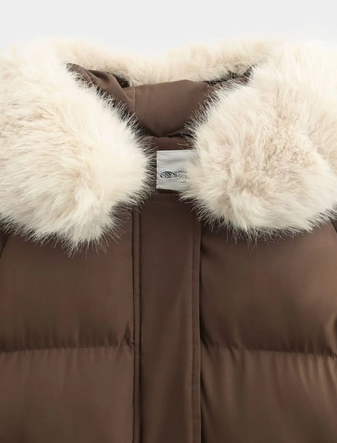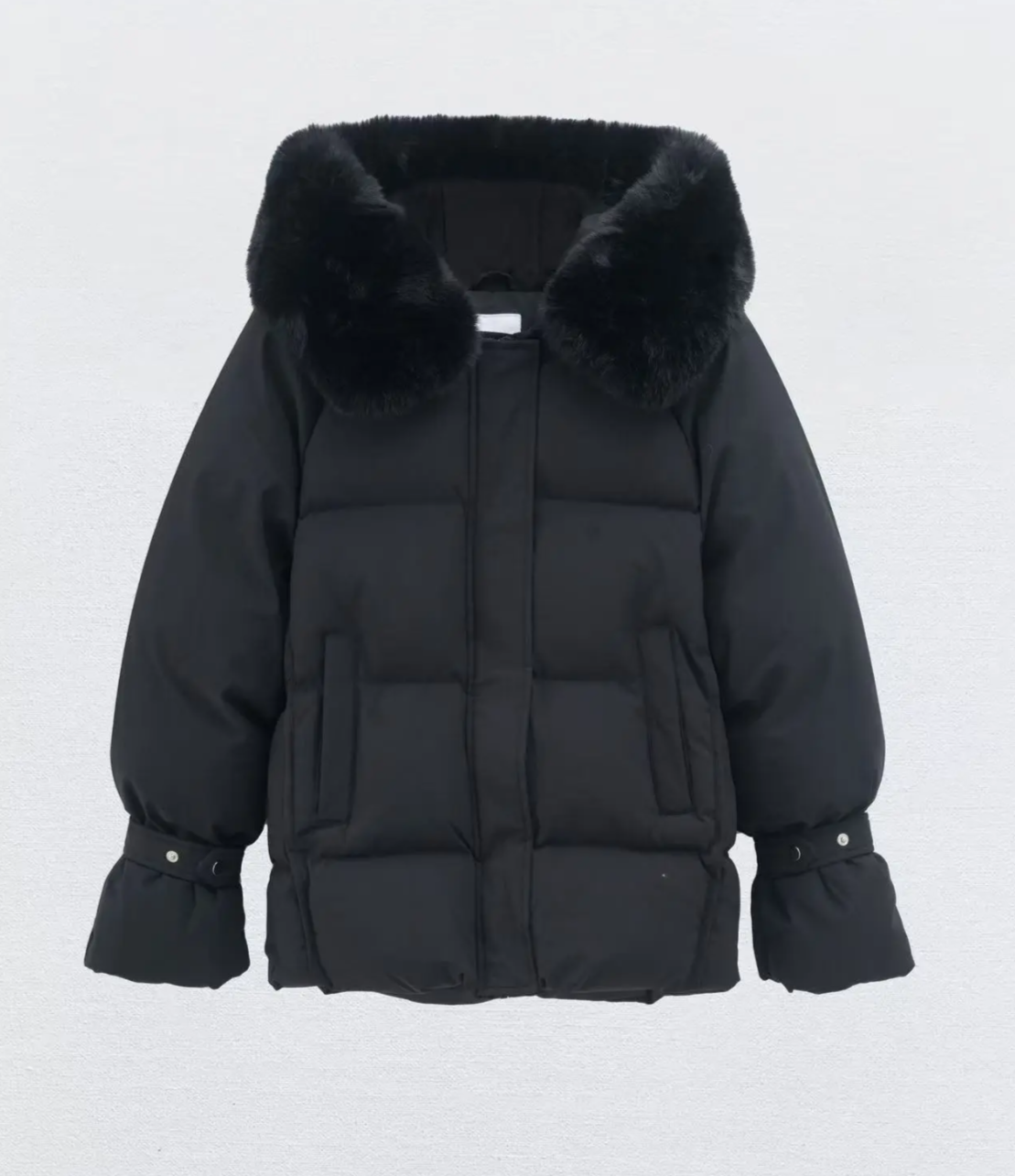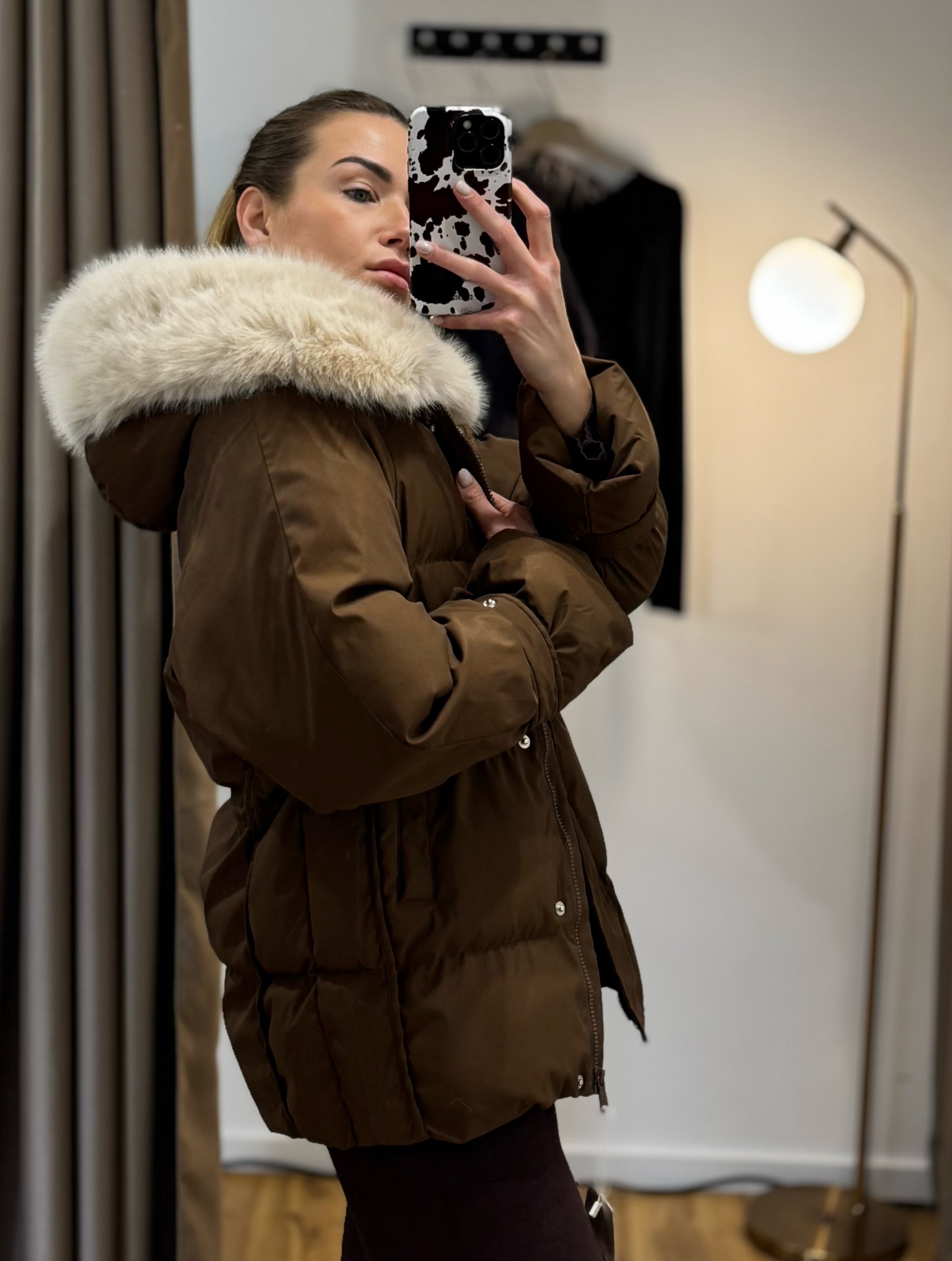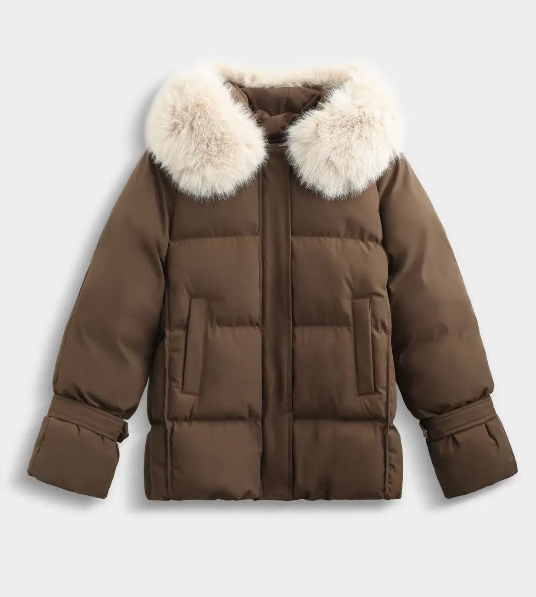 Dygsniuota pūkinė striukė eko pukų. Nusegamas gobtuvas su dirbtinio kailio apdaila. Ilgos rankovės su reguliuojamomis juostelėmis ir spaudėmis rankogaliuose. Priekyje – dvi įleistinės kišenės. Paslėptas užtrauktukas po atvartu su spaudėmis.